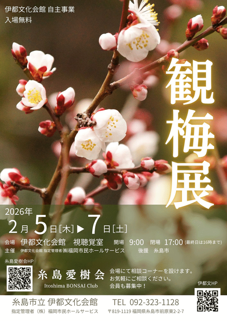 ●「糸島愛樹会」による「観梅展」を開催します。かわいい梅の花の香りと春を感じることができる作品が並びます。出展者が丹精を込めて育てた梅の美しさを楽しんでみませんか。